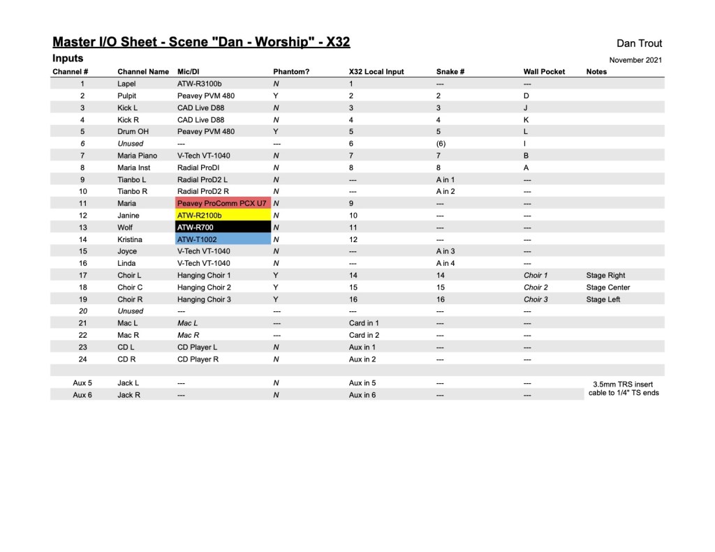 Recording Studio Tracking I/O Sheet