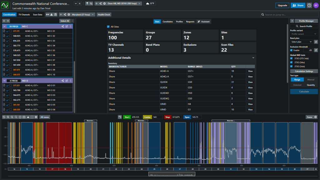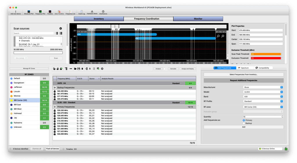 I’ll use SoundBase to calculate frequencies, send reports, and organize equipment. Shure Wireless Workbench then deploys frequencies and settings to the receivers.